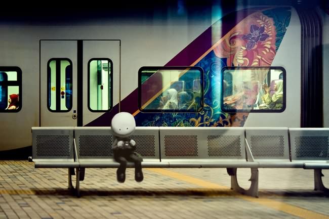 His pieces are dynamic and dark, often centering around lonely bulbous characters playfully interacting with the world around them. The cute little monsters seem to live in a human-like world filled with familar scenes seen in cities and the countryside — landscapes that are beautiful and lonely, seemingly unwilling or unable to take notice of the colorful creatures.