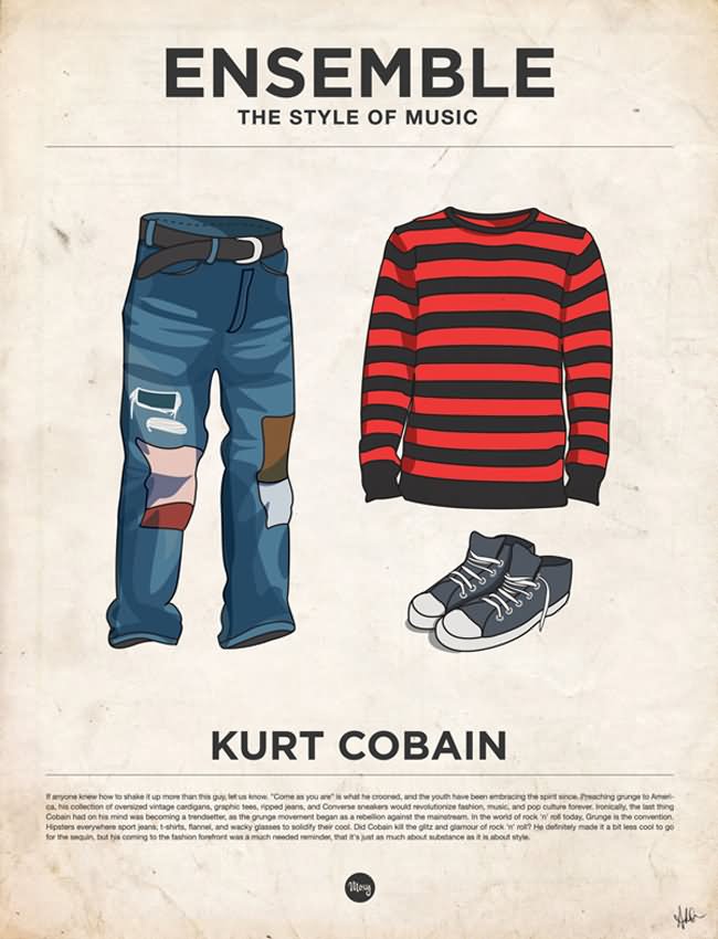 “Come as you are” is what Kurt Cobain crooned, and the youth have been embracing the spirit ever since. A pioneer of the ‘Grunge’ movement in the Pacific Northwest, his collection of oversized vintage cardigans, graphic T’s, ripped jeans, and Chuck Taylor’s would revolutionize fashion, music, and pop culture forever.