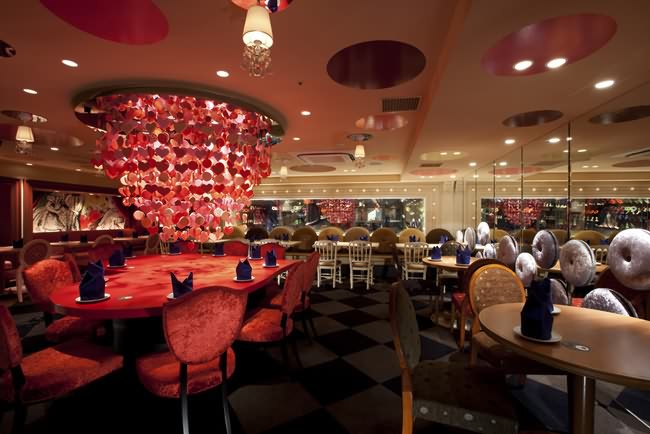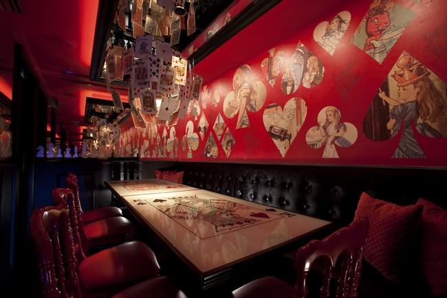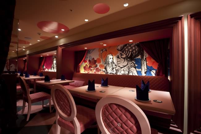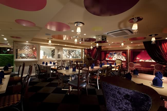 The entire story unfolds within the walls of the 2,250 square foot restaurant, from beginning to end. Upon entrance, guests are graced with oversized vintage books, mirrored walls, and polished checkered floors. Making your way to your table, you will find that larger than life grass hedges encase each table. Dramatic theatrical elements are in play throughout the entire space accompanied by intense lighting, various spots of color on the ceiling, and table napkins that sit upright, threatening to march away at any given moment. Fantastic Design Works designed a private dining room that’s fit for a queen! The queen of hearts and the rest of her deck is the main theme of the intimate dining space. The restaurant is an acutely literal take on the 1951 animated movie as it is divided into themed sections that reflect certain scenes from the film. If you are in the Tokyo area stop by for a bite, you never know where it could lead you!