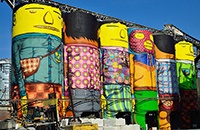 The latest chapter of their project was working on six 70-foot silos on Granville Island in Vancouver. The silos, part of the Ocean Cement manufacturing and distribution plant, were their first work in Canada. However, with each silo measuring 70 feet (22 meters) high and the mural covering a total of 23,500 square feet (7,200 sq meters), this piece is by far the biggest in their collection, and is their first foray into the three-dimensional mural format.
