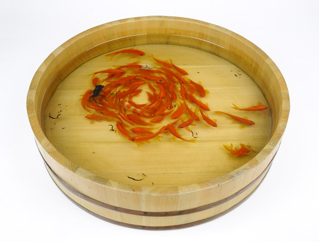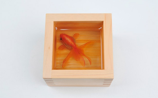 Riusuke Fukahori is a goldfish fanatic. There is a symbolic connection between him and his unusual monstrance. There was a period of crisis in Fukahori’s life, when he was fed up with everything and wanted to quit working on his art projects. There was a pressure of getting a “real job” but then he saw his neglected goldfish in their dirty tank and recognized the magic of it. Goldfishes can’t survive on their own, they need to be taken cared of and can’t survive winter without heat lamps. This amazing artist saw himself in it’s weakness. It is a weakness of a modern human reflected in the evolution of goldfish. The vulnerability of this creature makes Fukahori addicted, and that is what keeps him focused. But since everyone can have a bad day, so can he. That’s why, when he loses his focus, he just sits down and observe goldfishes. He keeps dozens of these little fishes in bowls, tanks and buckets around his apartment.