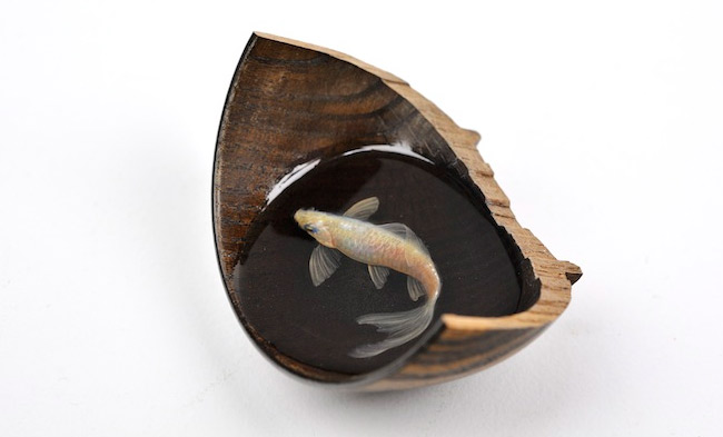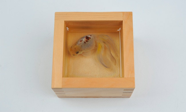 The artist does not use photographic source material, so when he paints, he paints from memory or sketches that he makes while watching them. Sketches are almost unrecognizable as a fish, but the most important is the sketch that stays in his mind. After sketching goldfish he uses the most interesting technique ever. He creates these realistic sculptures of swimming goldfish by a slow and meticulous process. First, he pours a layer of resin, lets it dry, and then paints a small portion of the fish on top it, lets it dry, and then pours another layer of resin, repeating this process until he makes a three-dimensional representation of a goldfish. There are many imitations of his art but this is what he says about them: “They will never understand goldfish the way I do. They are only copying the craft, not the soul.”