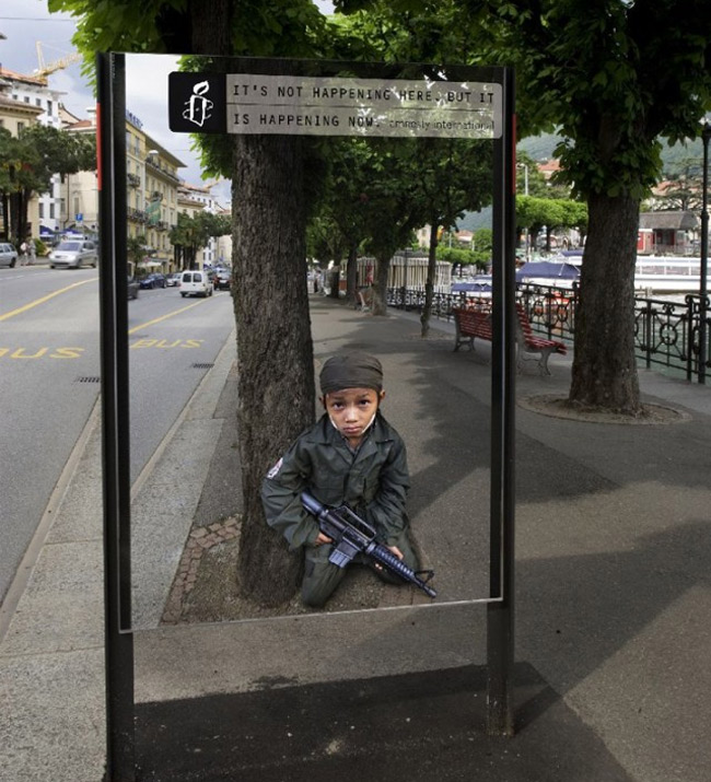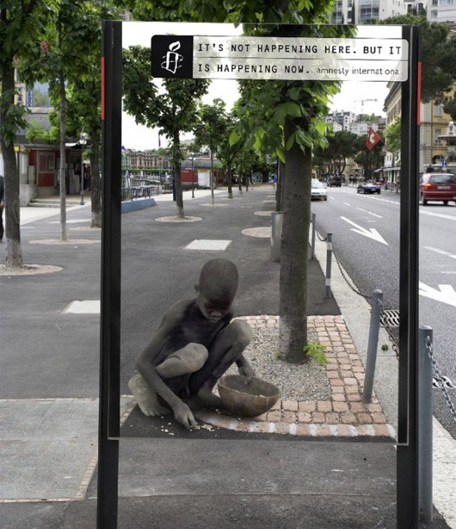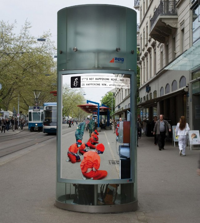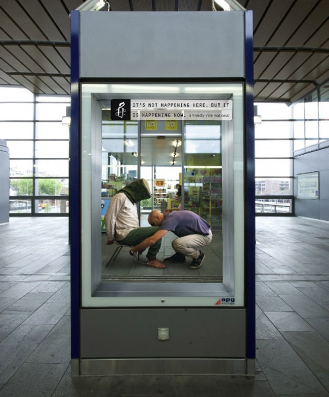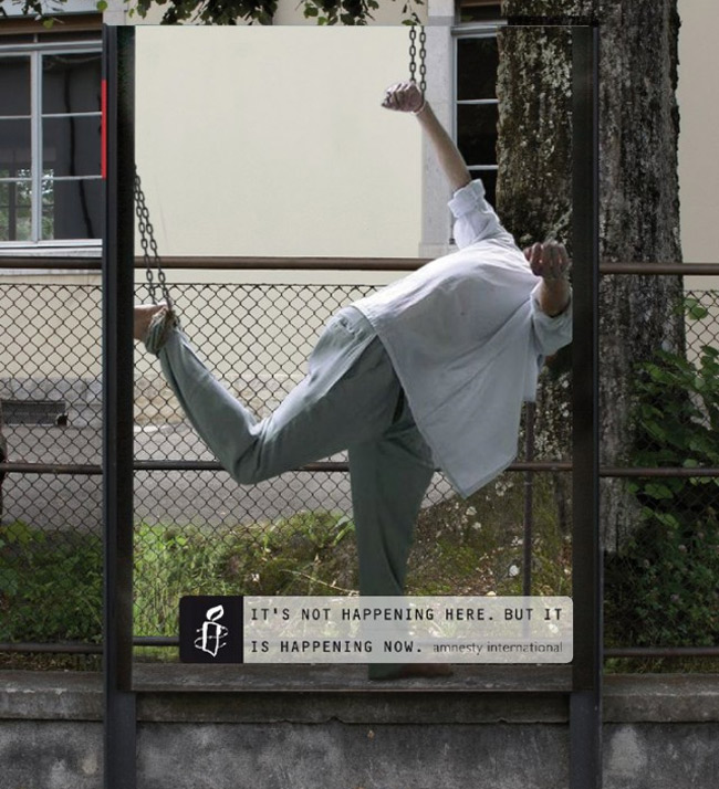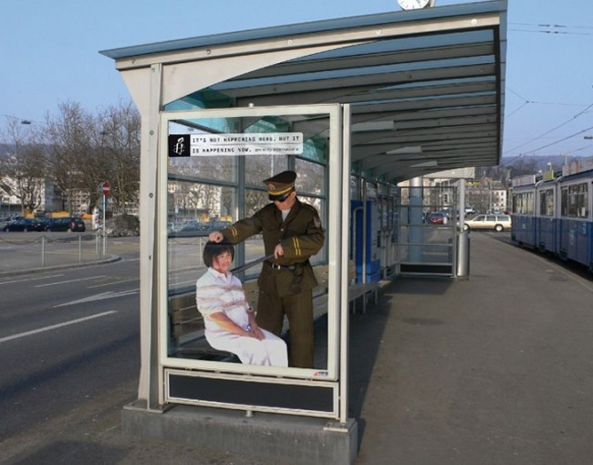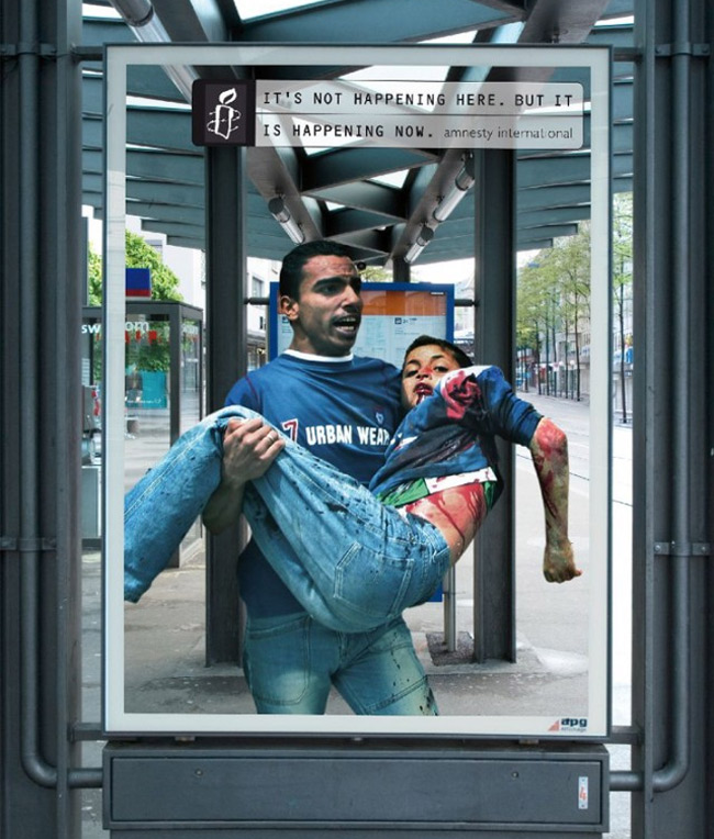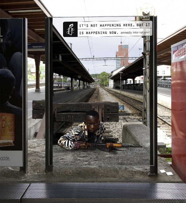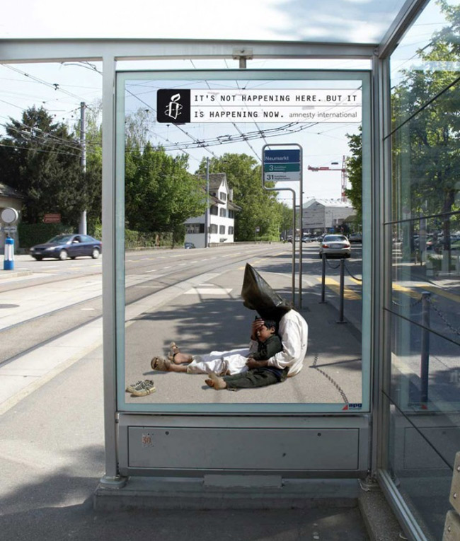 This is what Walker Agency for Amnesty International is trying to tell us with their clever campaign called “Not Here But Now”. They are putting posters all over the Switzerland of people whose rights have been taken from them and there is no one to help them. The situation is alarming and we have to see that. Their basic needs for food, water, shelter and safety are denied and our awareness of that is on disappointing level. The clever slogan “It is not happening here, but it is happening now” and the picture of desperate people are shown on the most random places of the city such as bus station. The ads portray issues in countries like Iraq, China, and Sudan.