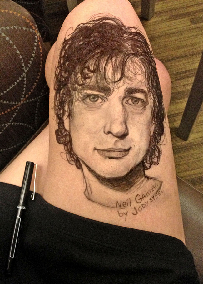 I began drawing on my legs during my classes and lectures. I’ve also drawn on notebook paper, but I found that drawing on my legs was both quicker and more efficient—not to mention my legs are just as pale as paper. It takes anywhere from 45 minutes to an hour to complete a drawing.