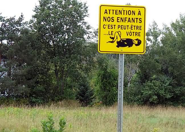 Rural Quebec is a strange land, with strange road signs. Take for example this one, which exhorts drivers in French to “watch out for our children, because it could be one of yours”. “It” being presumably, the child that you run over with your car. Which begs the question, why on Earth does the sign depict a child in the ideal position in which to become the victim of vehicular manslaughter?