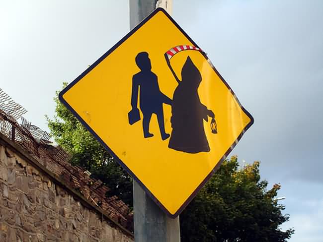 Are we to infer from this sign that a blind boy with a mild form of gigantism or elephantitis and a hand welded to a lunchbox has none other than the Grim Reaper as a personal crossing guard? Because if so, we may never visit Ireland again. At the very least not any neighbourhoods with a school zone.