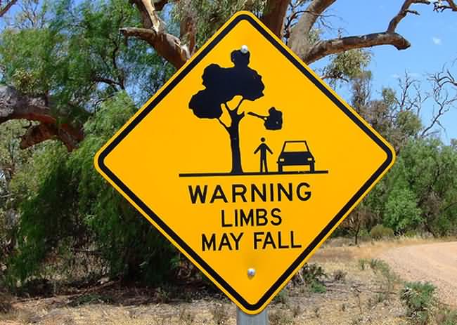 Chalk this one under “lawsuit filed, judgement rendered in favour of the plaintiff, sign erected”. How else to explain this overcautious caveat? Does this not apply to all trees? Last we checked, tree branches are susceptible to break and fall from time to time. It’s called lightning and gravity. Look into it. Besides, what kind of tool would pull over to the side of the road, disembark from his motor vehicle and stand under a large tree with creaky limbs?