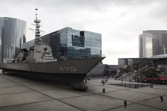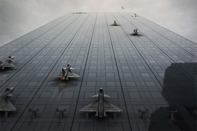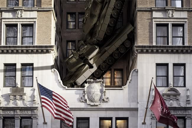 “The Military is omnipresent in our daily images, like a danger always present” says Caillard. “This is a humorous way to point out that all this military display might one day fall on our head.”