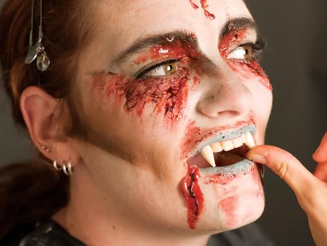Now add the vampire teeth and a trickle of stage blood (or, if you’re feeling especially gruesome, slather your face with stage blood), and dress appropriately. Vampires used to dress in Victorian evening clothes. Nowadays they tend to wear a lot of black leather and latex, so a local fetish shop might be able to help you with your costuming needs.