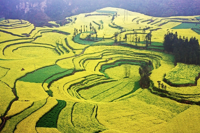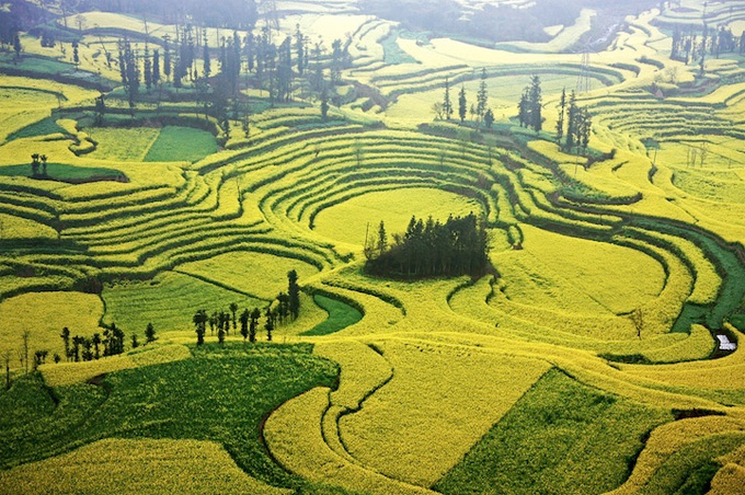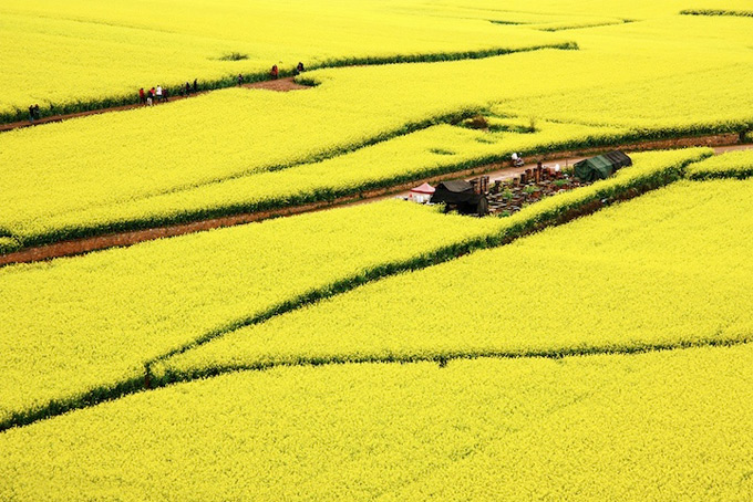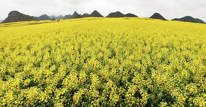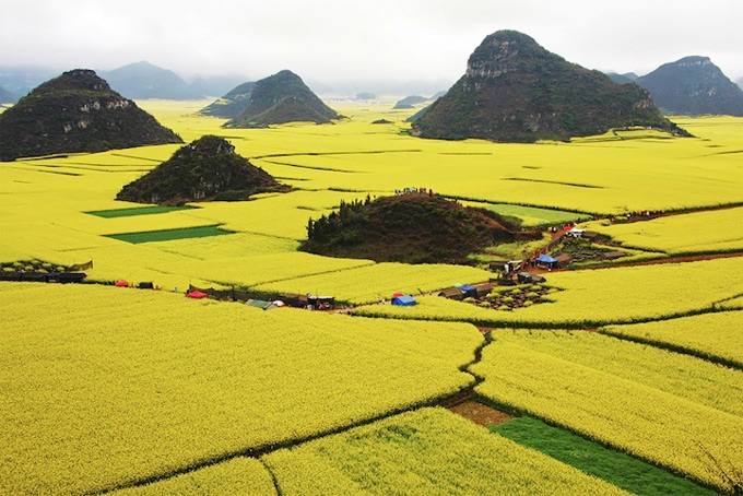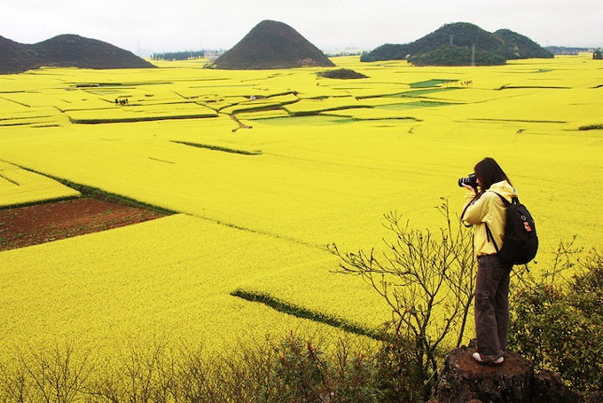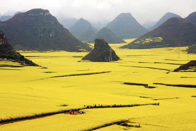 The county of Luoping is known for its breath taking view when its fields of canola (also known as rapeseed flower) are in the full bloom. Hills scattered on the yellow surface of rapeseed flowers and the refreshing essence of spring makes visitors hypnotized. This spectacular sight is located near where Yunnan meets Guizhou and Guangxi and it is about 240 kilometers east of Kunming which is the capital and largest city of Yunnan province in Southwest China. China produces 15 million tonnes of rapeseed a year to feed its only internal demand for the oil produced by the crop for both cooking and as a bio fuel, so these fields can be found all over the country. However, Luoping is the leader when it comes to attracting visitors.