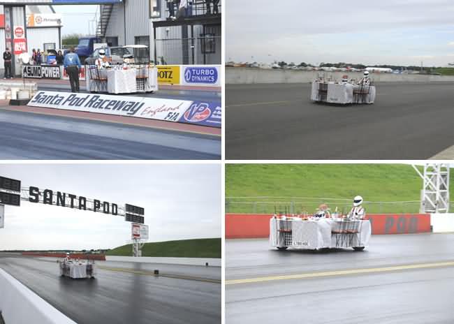 British 47-year-old designer Perry Watkins, who already holds the record for the world’s smallest and flattest cars, finally finished his super speedy dining table. The Nitrous oxide injected V8 dining table, named Fast Food, at Santa Pod raceway did two officially timed runs. The first timed at 112.8 and the second at 114.8 giving a new world record time of 113.8 MPH, and comfortably eclipsing the 92mph set by a sofa in 2007. These speeds are an average speed over a 500 metres measured track not a top speed, the terminal top speed at the end of the run was in excess of 130 MPH.