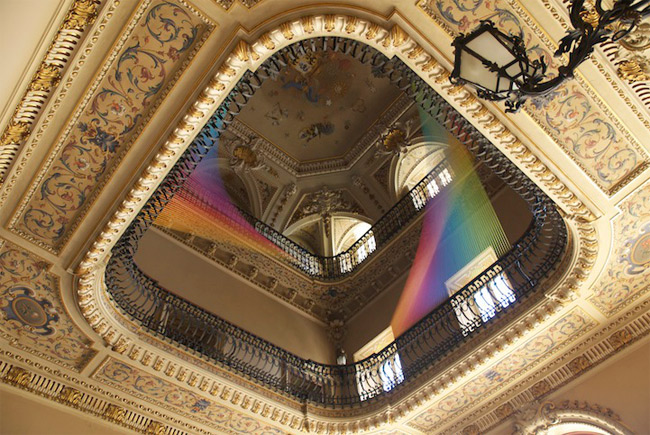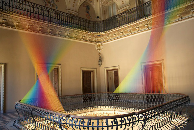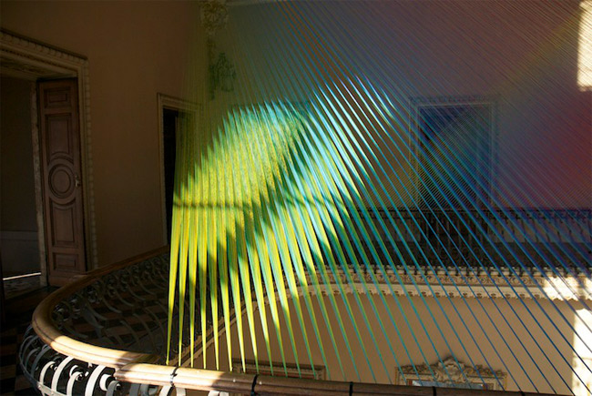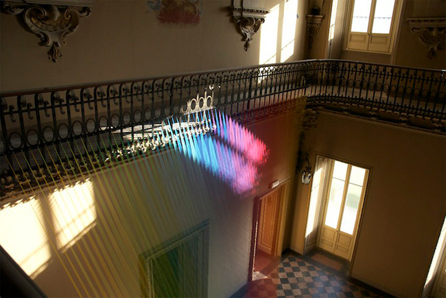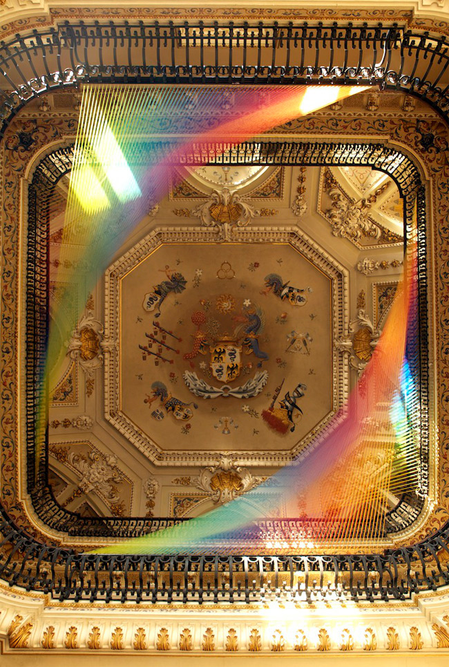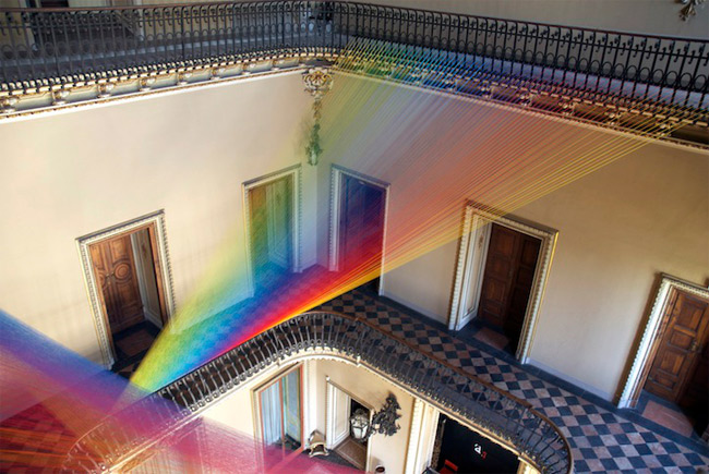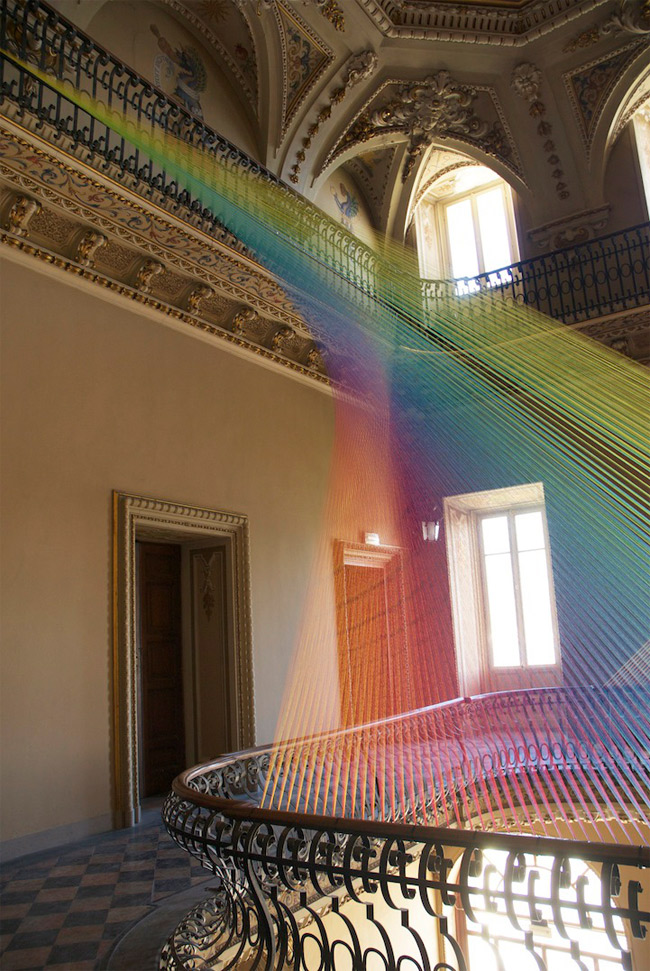 This year an annual exhibition of contemporary art Miniartextil has exceeded all the expectations and caught attention of many art lovers. The theme was Agora, symbolizing an important public place in ancient Greece, where people used to gather and exchange ideas. So, the visitors were invited to involve in the art work not just to look at it. As part of Miniartextil the most impressive installation was Plexus no.19 by an amazing artist Gabriel Dawe. He is known by his huge transparent structures created out of brightly colored threads and his Plexus series. This one, the Plexus no.19 is an incredible installation that spreads across two balconies in the atrium of the early 19th century neoclassic house called Villa Olmo. This historic villa was vested by the municipality of Como in 1924 and today it is opened for cultural events and exhibitions.