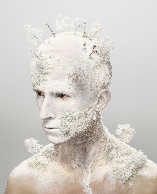 Levi van Veluw‘s photo series are self-portraits, drawn and photographed by himself, a one-man-process. His works constitute elemental transfers, modifying the face as object, combining it with other stylistic elements to create a third visual object of great visual impact. The work you see therefore is not a portrait, but an information-rich image of colour, form, texture, and content. The image contains the history of a short creative process, with the artist shifting between the entities of subject and object.