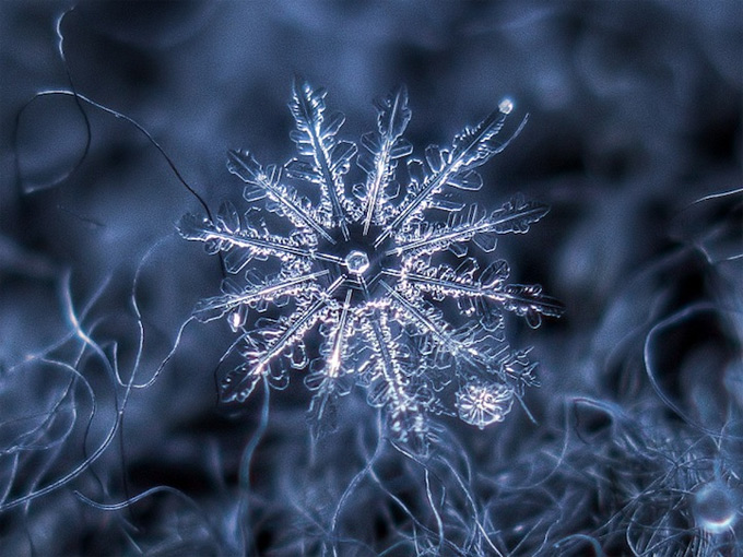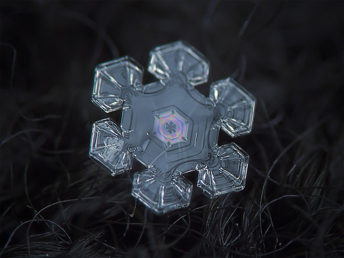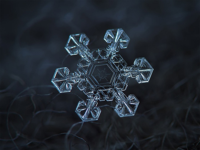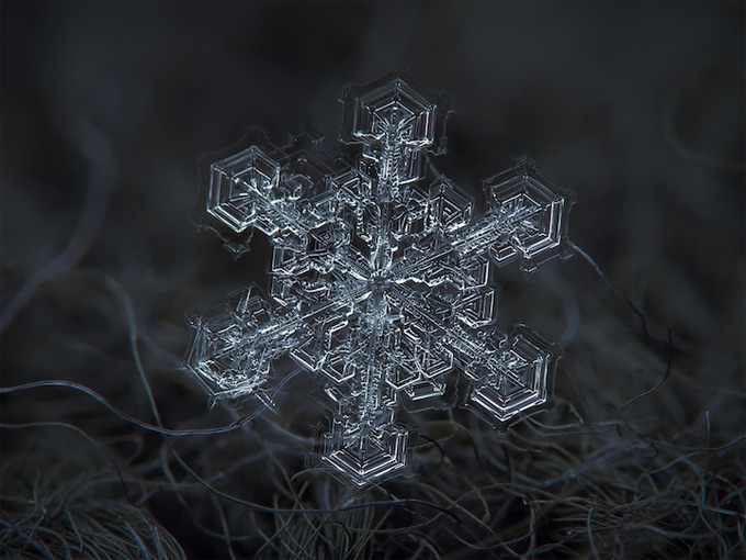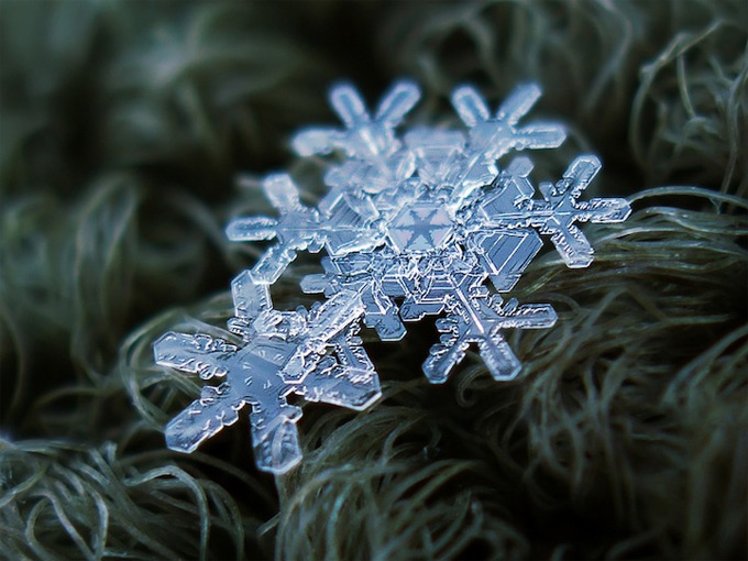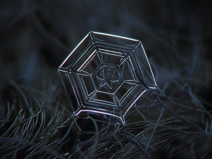 His found the inspiration in Don Komarechka, Canadian based professional photographer, who recently published great book about his methods of snowflake photography, physics of ice crystals formation and many other interesting topics. Also, biography and work of Wilson Bentley, pioneer of snowflake photography influenced his work. When we look out the window on a snowy day, we stop seeing a scintillating sea of microscopic crystals too vast to count. There are just white paths and we rarely remember to ask ourselves what is the secret beauty of the snowflake. The appearance of white color is one of snowflakes powers, they are clearly made of ice but this is due to diffuse reflection of the whole spectrum of light by the small crystal facets. Other powers you can see on Alexej’s photos. Using very simple techniques, his macro photography makes individual snowflakes look like otherworldly castles, frozen in space as well as time.