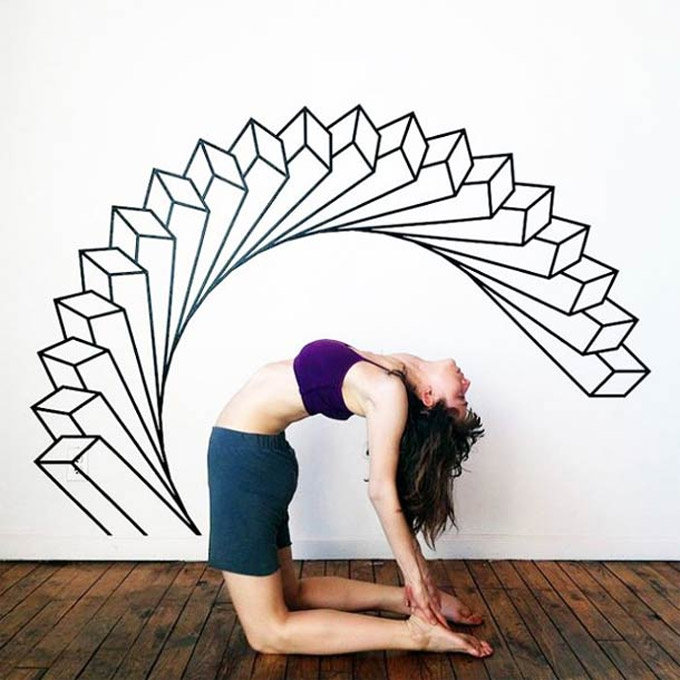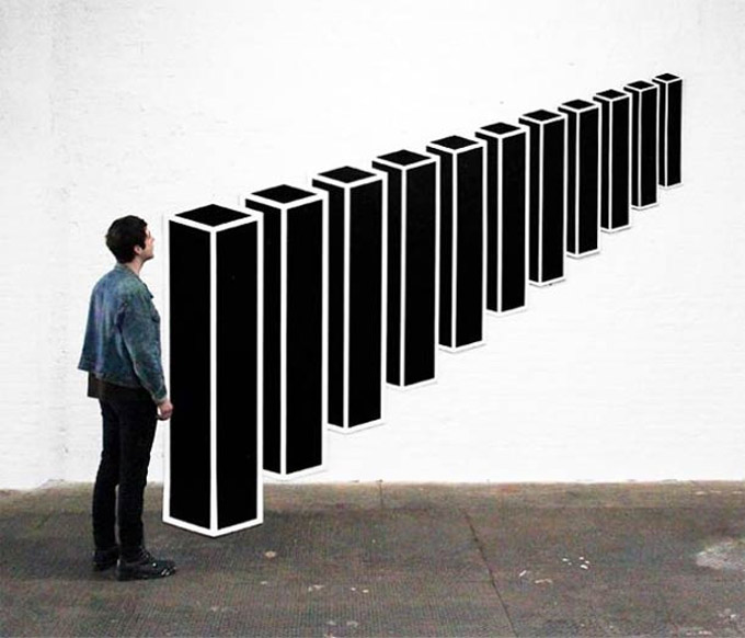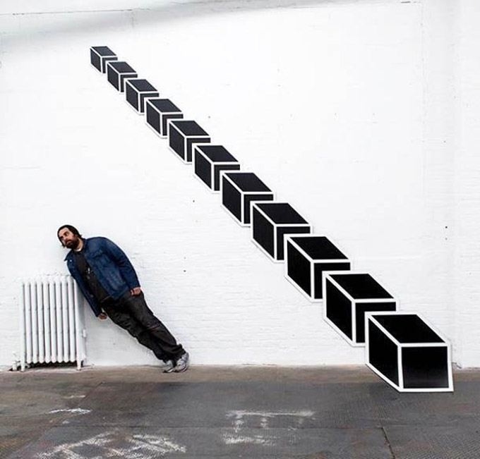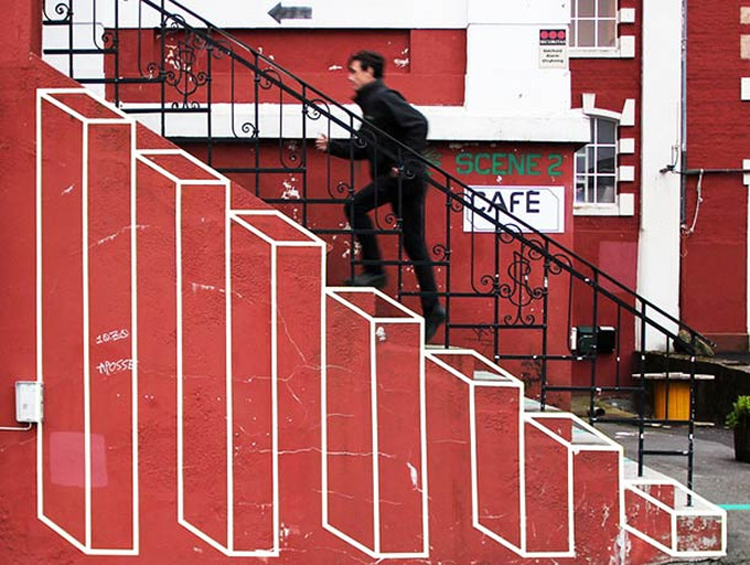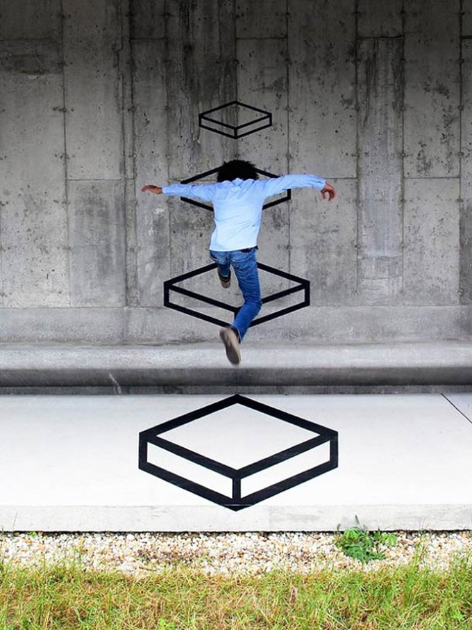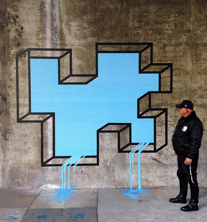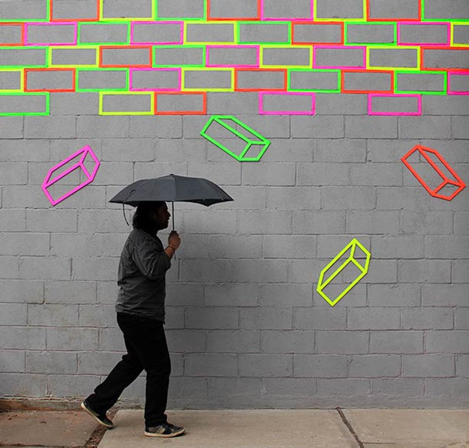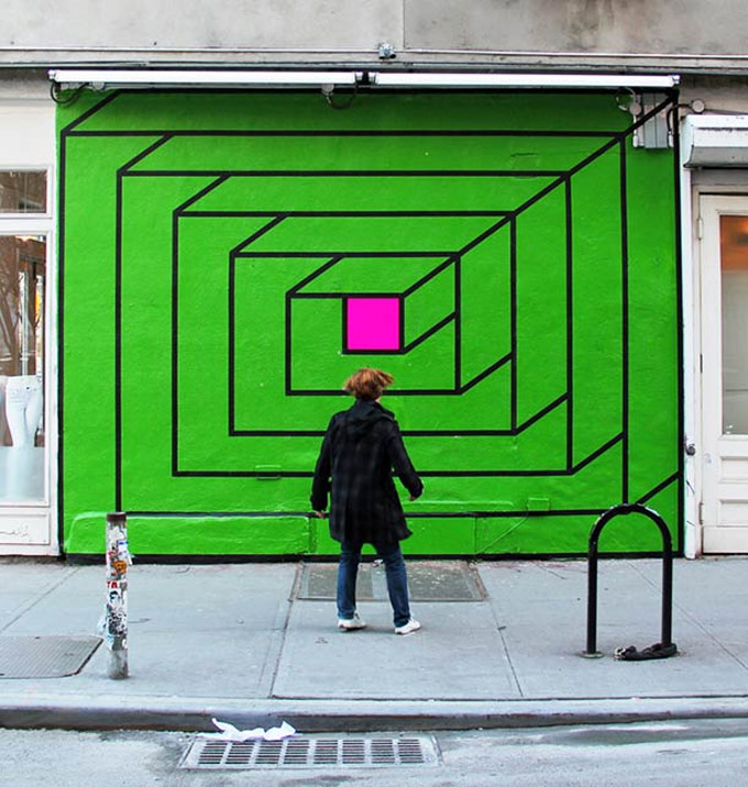 He is talented and innovating artist that is lead by his feeling without settling for the boundaries. There is not much philosophy behind Aakash Nihalanis street art, there is just connecting dots in the reality and creating new and fun way to escape grey urban environment. Sidewalks, doorways, buildings and bricks are highlighted in a way that they create isometric rectangles and squares, and that is what is recognizable in Aakashs work. Working with tape is what makes him different in street art scenary. The flexibility of tape and that it’s not damaging to the built environment he is working on is what makes it the main instrument for building the different New York. The main influence at his work besides the city architecture is actually himself as a kid: “I also was really into magic tricks as a kid, and optical illusions, so I’m sure that’s still embedded in the way I approach things, manipulating positive and negative space to create an alternative