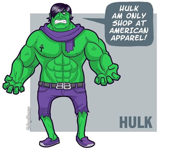 Superheroes are supposed to strike terror into the hearts of bad guys everywhere. But if those superheroes were urban hipsters, well, there wouldn’t be too much terror-striking going on then. Who cares? It would be FUNNY. Just try not to laugh at Emo Hulk.