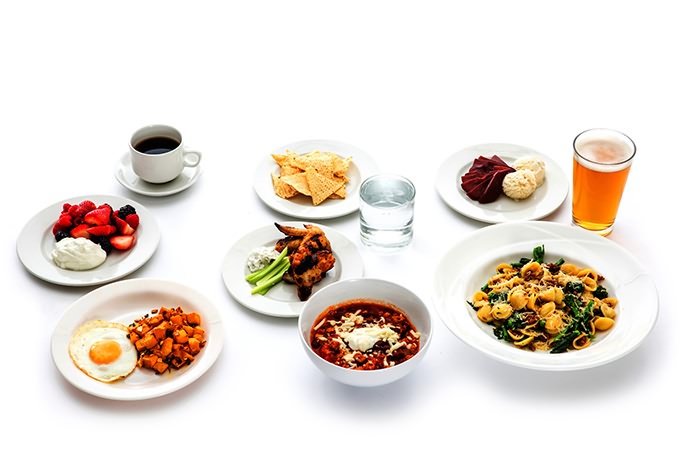 AT HOME Butternut squash hash with fried egg (175), turkey chili (410), tortilla chips (120), water (0), coffee (2), chicken wings (280), berries with yogurt (130), orecchiette with chicken sausage and broccoli rabe (435), beer (155), ice cream with poached pear (370).