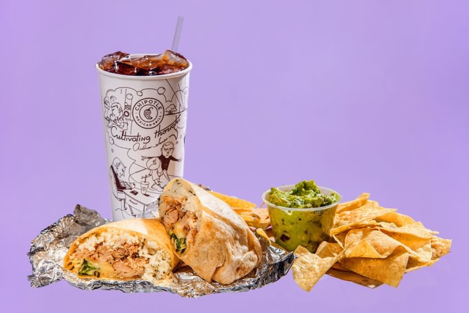 CHIPOTLE Carnitas burrito (945), chips and guacamole (770), Coke (276).