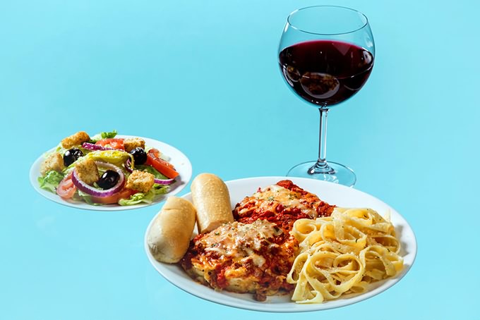 OLIVE GARDEN Salad (150), breadstick (140), Tour of Italy sampler (1,500), quartino of wine (230).