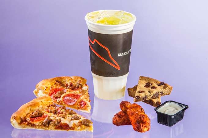 PIZZA HUT Meat Lover’s Stuffed Crust pizza (880), baked wings with blue cheese (340), Mountain Dew (440), two cookies (360).