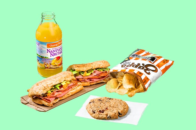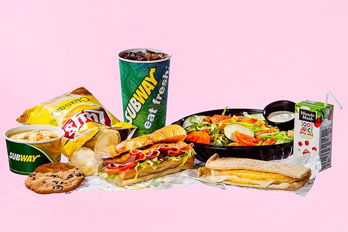 SUBWAY Cold-cut combo (375), chips (230), chicken noodle soup with oyster crackers (155), cookie (220), Buffalo-chicken salad (360), Coke (200), egg-and-cheese flatbread (370), juice (100).
