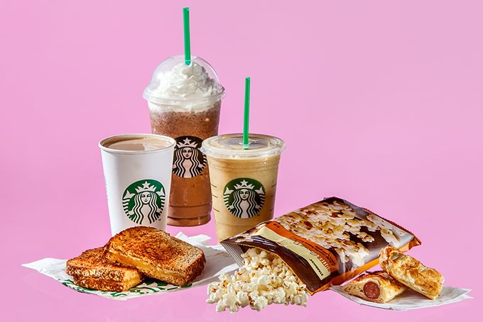 STARBUCKS Java Chip Frappucino (460), latte (190), orange mango smoothie (270), grilled cheese (580), popcorn (125), sausage croissant (410).