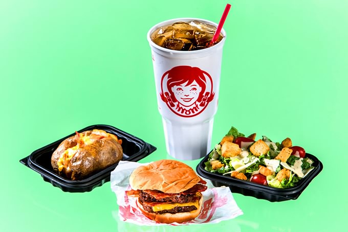 WENDY’S Baconator Cheeseburger (940), Potato with bacon and cheese (520), Caesar salad (250), Coke (320).