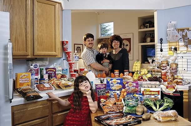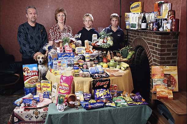 In 2005 Menzel took a photographic survey of the diets of families around the world, documenting what they purchased and ate in the course of a week. The results are visually striking – Menzel has cleverly remade the classic family portrait as an intimate archive of consumption and metabolism – and they also reveal a remarkable range in the quantity, quality, and variety of foods that families across the world take as quotidian.